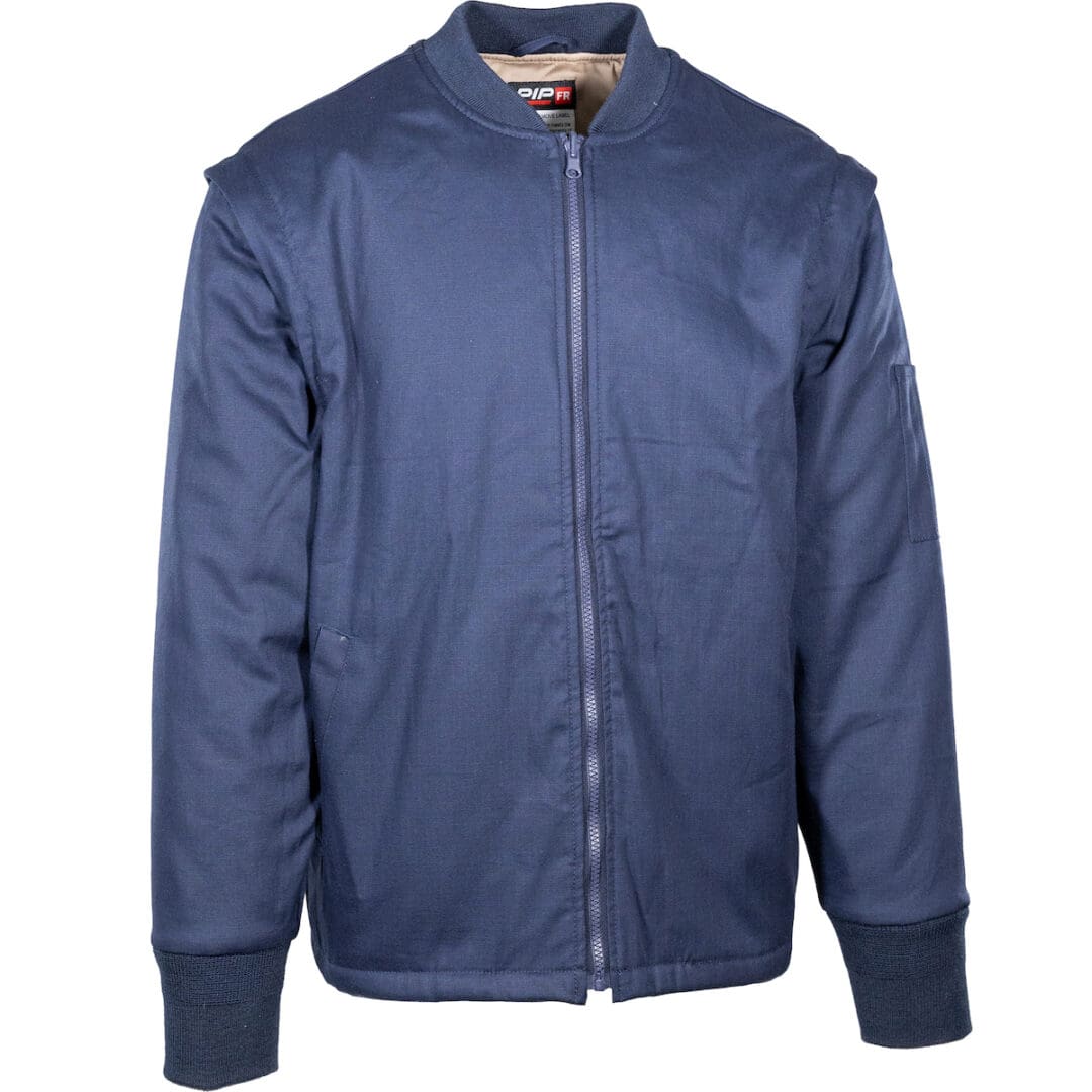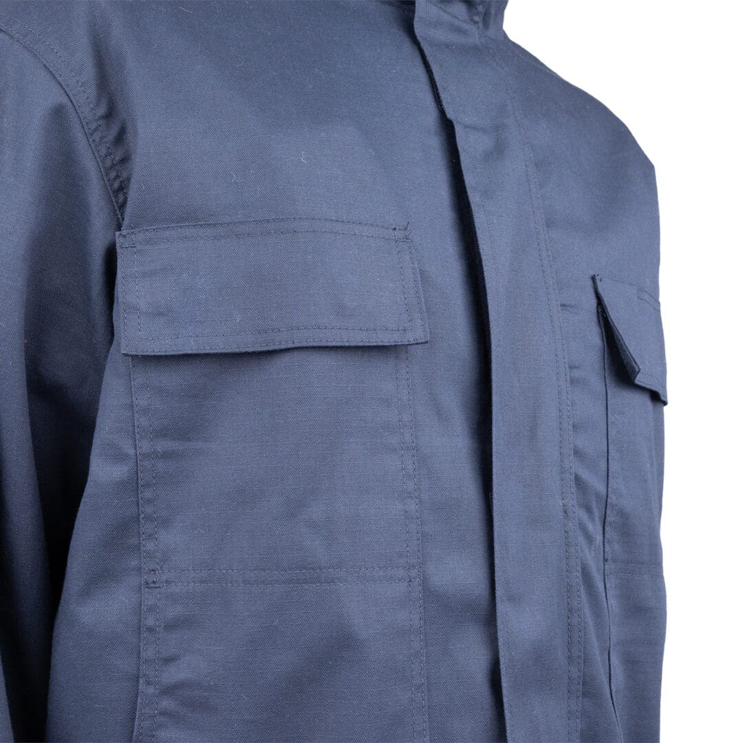 7oz Ripstop 88% Cotton/ 12% Nylon Fabric with 7oz Khaki FR twill weave fabric for lining|High tenacity Aramid FR thread, bar-tacked at all stress points|Protective stand-up collar with hook and loop closure|Detachable hood with 3 snaps that attach to jacket|Heavy Duty brass zipper, with storm guard and hook and loop closure|Action back for added mobility|Adjustable hook and loop sleeve tab|2 Chest patch pockets with hook and loop closure, Pen pocket on left sleeve, 2 waist patch pocket, and 1 inside pocket with hook and loop closure|ATPV 26 Cal/cm2, CAT 3|7oz Navy FR Ripstop 88% Cotton, 12% Nylon Fabric, with 14oz Khaki 100% Modacrylic lining|High tenacity Aramid FR thread, bar-tacked at all stress points|One-way reversible resin zipper on aramid tape|Can be worn alone or zipper into Outer Shell|Detachable sleeves that covert into vest|2 Slash pockets at the waist, and Pen pocket on left sleeve|ATPV 33 Cal/Cm2, CAT 3|UL Certified to NFPA 2112-2023|Renewably sourced, non-fluorinated water repellent treatment|NFPA 70E, ASTM F1506|OEKO-TEX Standard 100