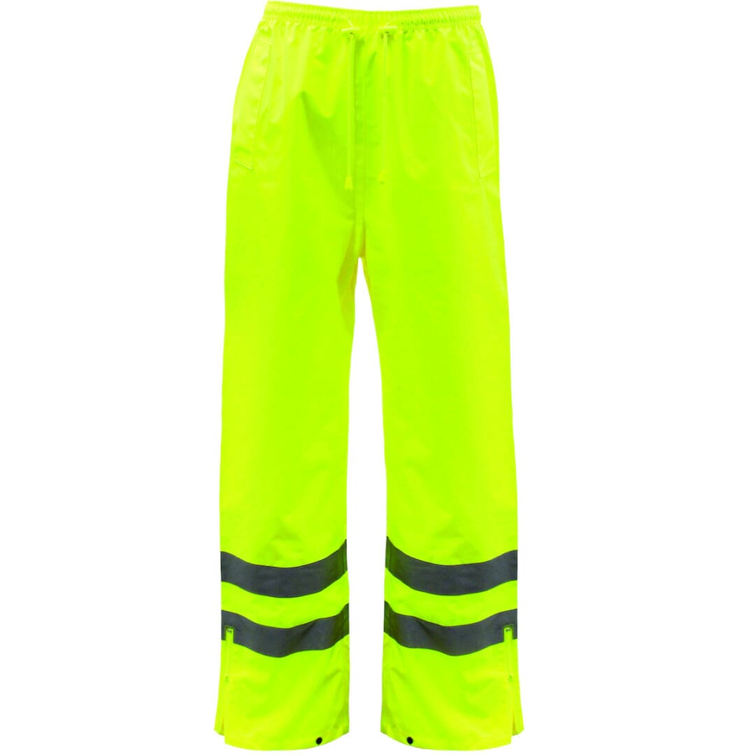 100% Polyester 300D Oxford PU Coated|Waterproof High Visibility Yellow With Reflective Striping|Unlined & Breathable To Keep You Cool In Warm Environments|Waterproof Taped Seams|Elastic Waist With Drawstrings|Front Pocket Access|Ankle Zipper & Take-Up Snaps