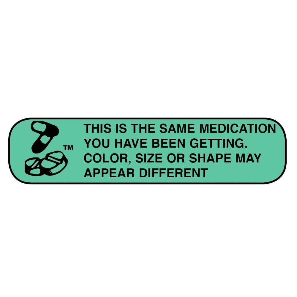 Pre-Printed Label Apothecary Products® Auxiliary Label Green Paper This is the Same Medication you have been getting, color and size or shape may appear different 3/8 X 9/16 Inch