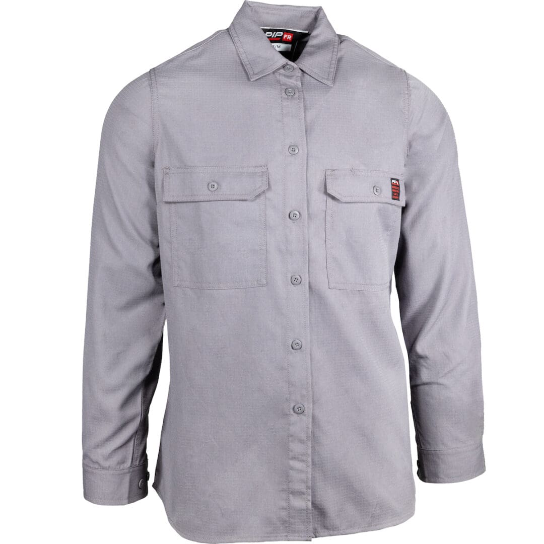 Women’s fit|6oz. Modacrylic/Cotton/Aramid blend|Ripstop material provides added durability and tear resistance|ARC Rating: ATPV 9 cal/cm2|2 chest pockets with buttoned flap closure and pencil slots|Radial loops on both shoulders|Aramid high-tenacity FR thread|Melamine FR buttons, front closure, collar, cuffs and pockets|Dual-certified to NFPA 70E (ASTM F1506) and NFPA 2112-2023 standards|UL Certified garment|OEKO-TEX Standard 100|ISO 11612, ISO 1149-3|2% Antistatic