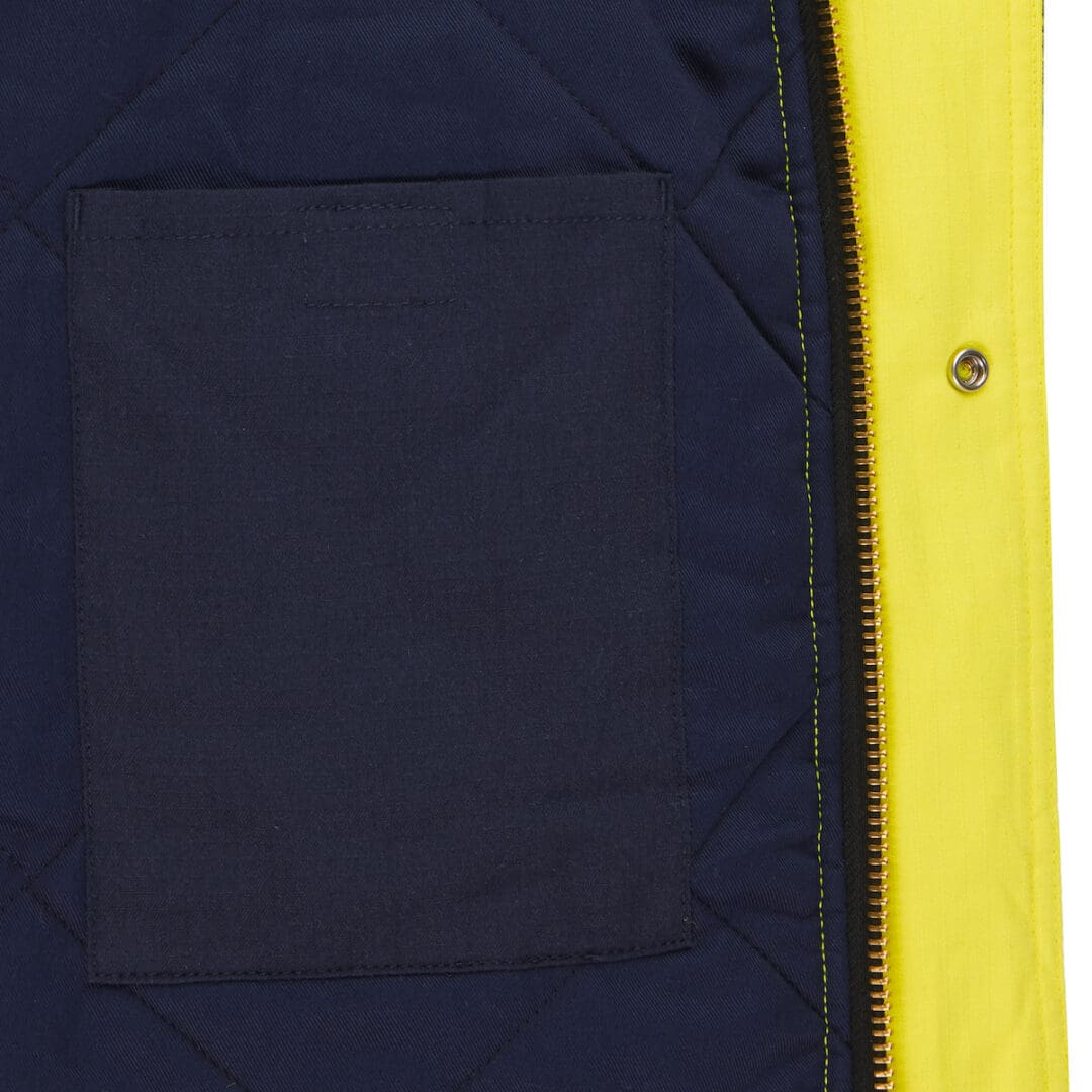 ANSI 107 Type R Class 3|ARC Rating: PPE 4 ATPV 40.0 cal/cm2|7oz FR inherent ripstop outer fabric for added durability|14oz FR modacrylic/cotton insulation, for extra warmth in extreme cold conditions|High tenacity Aramid thread to withstand stress during fire exposure and high temperatures|1% Antistatic to help inhibit electrostatic discharge (ESD)|Detachable insulated hood with contrast lining|2 in silver FR reflective H-tape for optimal visibility|Navy bottom helps hide dirt|Twin waist patch pockets with flap closures|One internal pocket|Mic tabs and pen pocket at shoulders for convenience|Two piece structured, contrast color collar|Melamine FR buttons, and FR closures|Renewably sourced, non-fluorinated water repellent treatment|Dual-certified to NFPA 70E (ASTM F1506) and NFPA 2112-2023 standards|OEKO-TEX® Standard 100