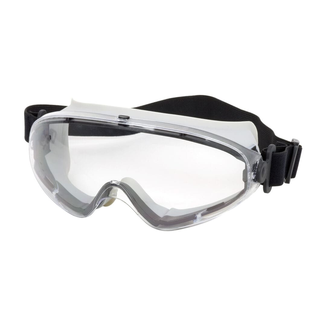 Offers indirect ventilation for liquid splash protection|Wide facial flange for a secure seal|Flexible, soft rubber/polyester body for optimal comfort and fit|Fits comfortably over most prescription glasses|Nose area split to fit the vast majority of users|Wide adjustable (non-latex) headband strap|Headband strap attaches to frame with a swivel clip to ensure a comfortable fit|Antifog lens coating|Comes individually boxed|5.25 Base curve lens