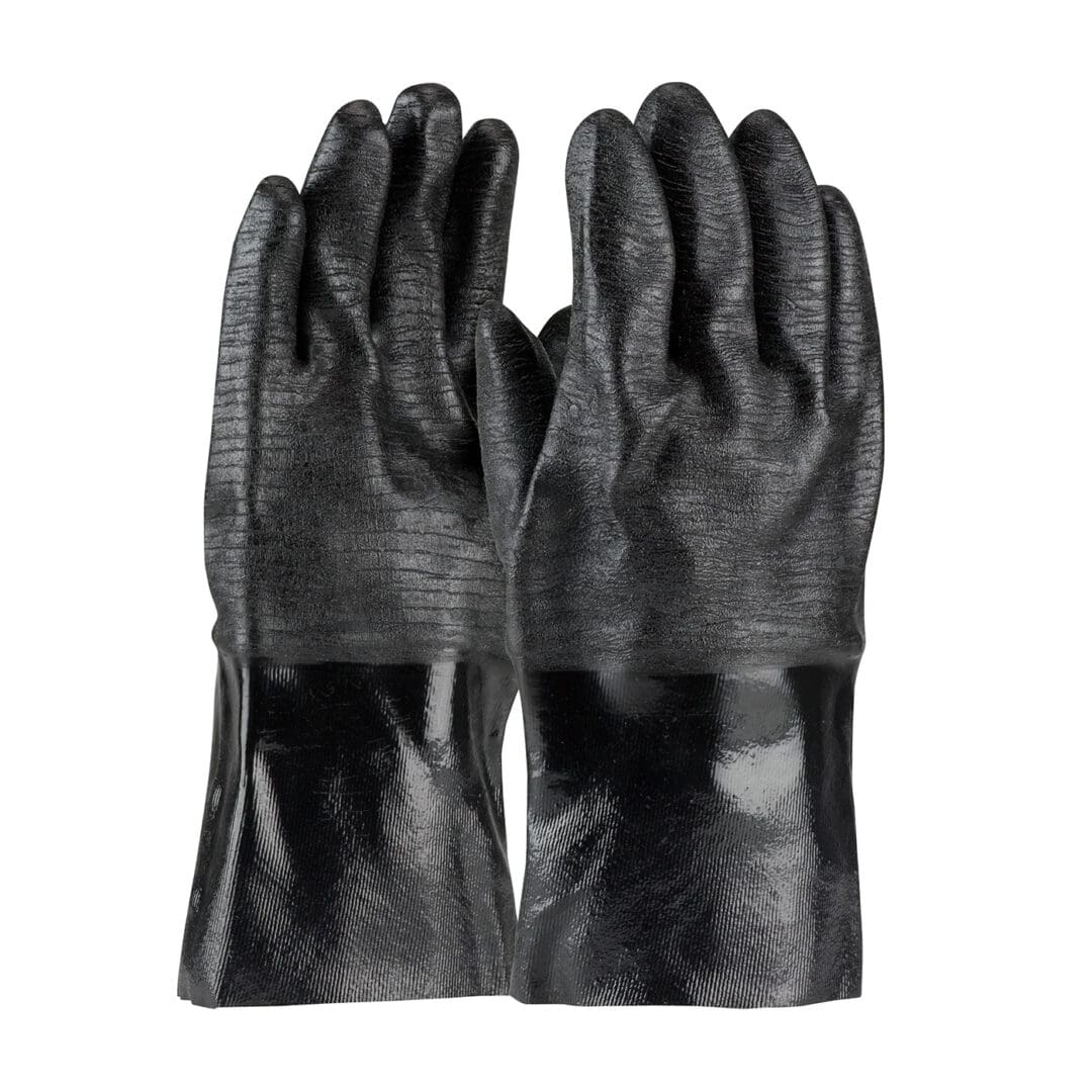 Neoprene gloves provide superior protection from a wide range of chemicals such as acids, caustics, solvents and oils|Multi-dip process provides fully liquid-proof protection|Etched rough finish has excellent non-slip grip and cut resistance|Gauntlet cuff for added forearm protection|Black color hides dirt
